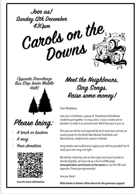We’re excited to announce that following on from an initiative started last year by local Sneyd Park residents in Downleaze and Rockleaze, there will be Carols on the Downs taking place on Sunday, 12th December. For more details, please see this image below.